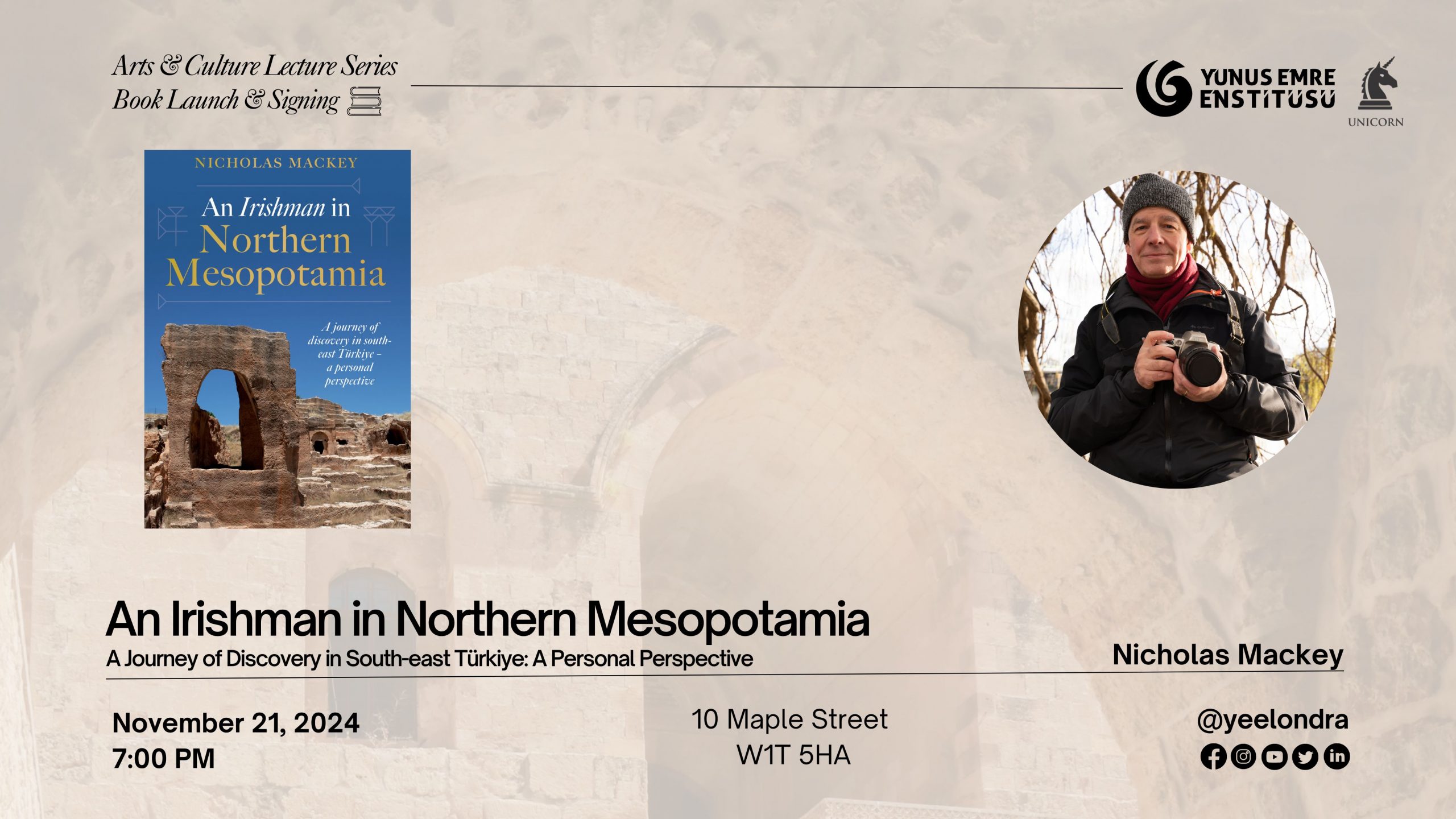 Yunus Emre Institute London is pleased to host an evening with Nicholas Mackey on 21 November 2024 at 7 PM, as part of the Arts and Culture Lecture Series. In collaboration with Unicorn Publishing, this event will feature a presentation on Mackey’s latest book, An Irishman in Northern Mesopotamia: A Journey of Discovery in South-east Türkiye: A Personal Perspective, which delves into the rich historical and cultural heritage of south-east Türkiye, a region cradled by the legendary Euphrates and Tigris rivers.